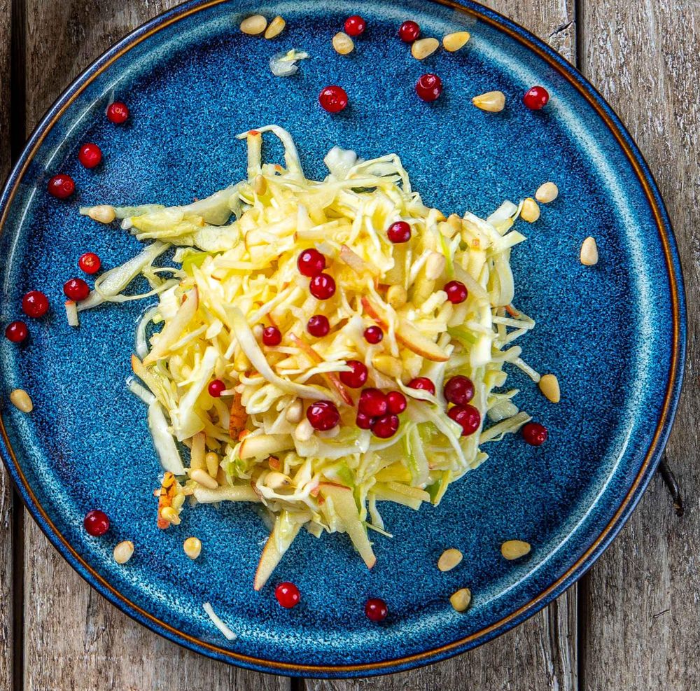 Тонкая соломка хрусткой капусты и сочного яблока, заправленная легким цитрусовым соком. Кислинка брусники и благородные нотки кедрового ореха делают этот салат по-настоящему живым и освежающим