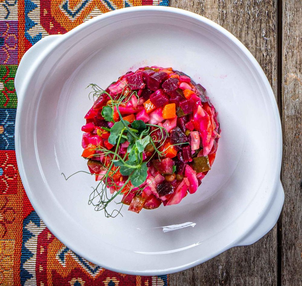 Мягкая свекла, хрусткая квашеная капуста и маринованный огурец в компании с горошком и морковью. Заправлен ароматным нерафинированным маслом, а нежный росток гороха добавляет летней свежести