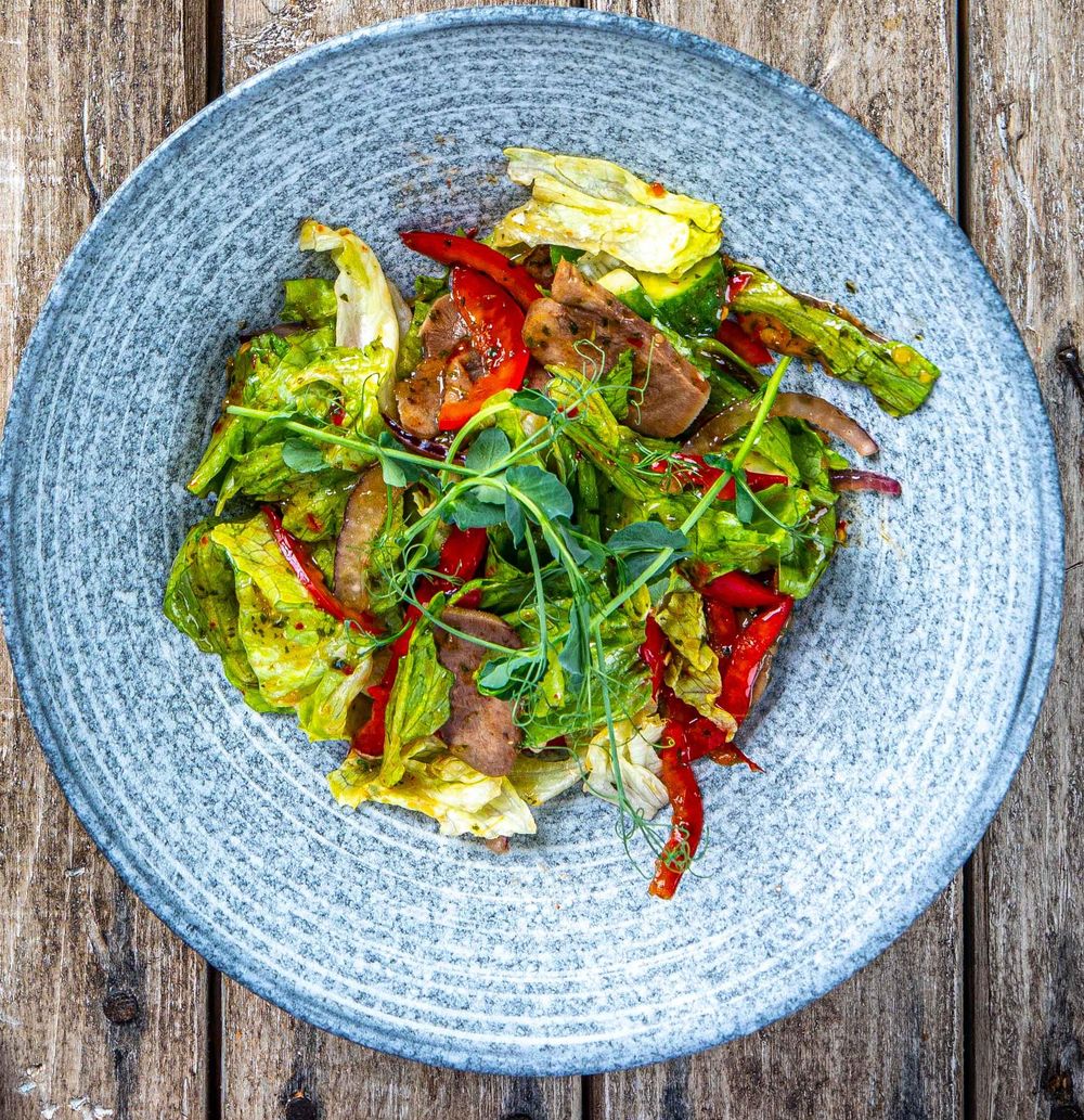 Ломтики говяжьего языка в компании хрусткого айсберга, сладкого болгарского перца и свежего огурца. Красный лук добавляет остроты, а зеленый лук — весенней свежести. Всё это под фирменным соусом чили с мятой — пикантно, освежающе и очень гармонично.