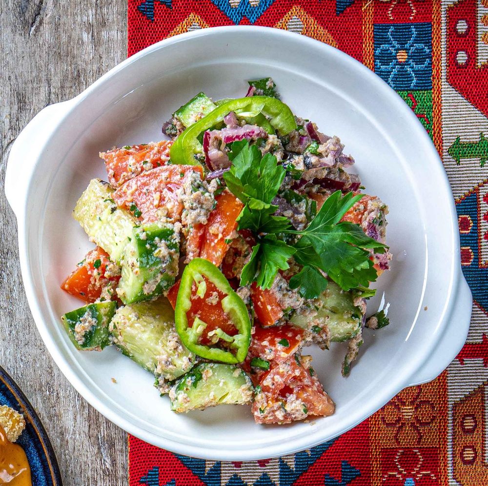 Спелые томаты и хрустящие огурцы, свежая зелень — кинза, петрушка. Красный лук и тонко нарезанный чили добавляют огонька. Заправка масло, уксус и грецкие орехи. Сочный, живой, настоящий.