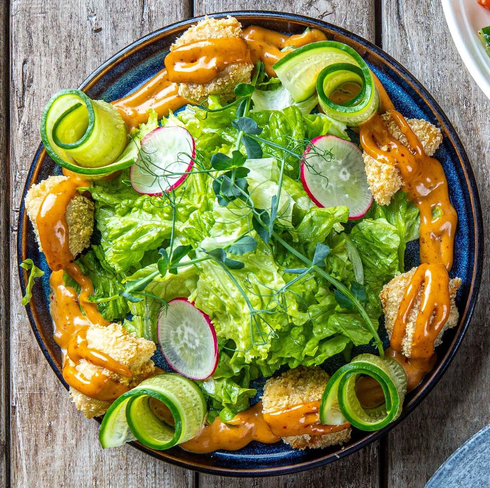 Нежное куриное филе в хрустящей панировке, тонко нарезанные свежие огурцы и редис на подушке из листового салата. Всё это под соусом карри с насыщенным арахисовым вкусом. Сочный микс текстур и восточных нот