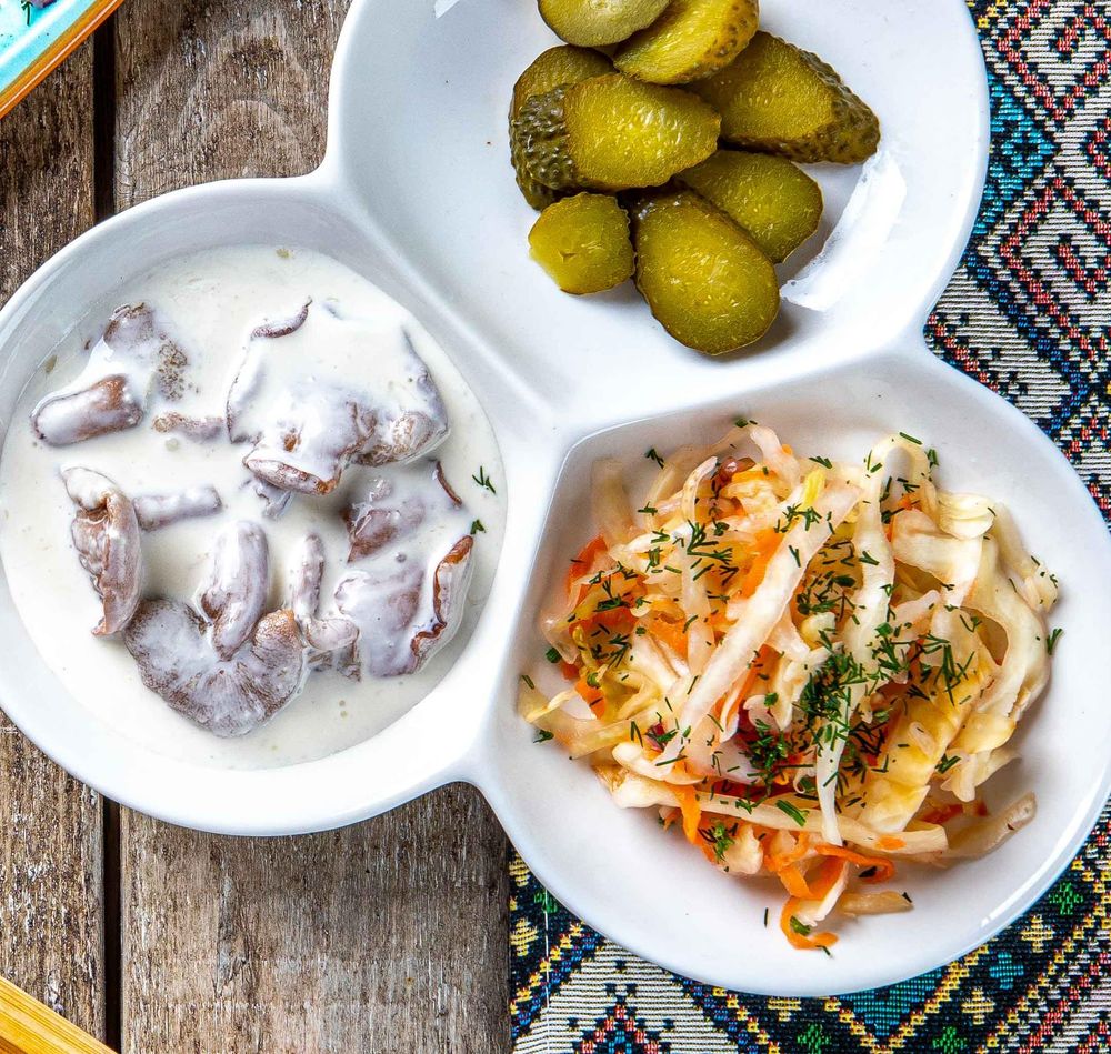 Квашеная капуста, маринованные огурцы и грибы в сметане с чесноком. Под разговор и не только