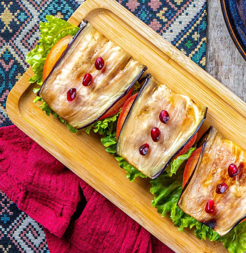 Баклажаны, помидоры, грецкий орех и щедрая россыпь граната. Но главное внутри — сулугуни и креметто с грузинскими специями. Съедаются незаметно, а потом хочется еще
