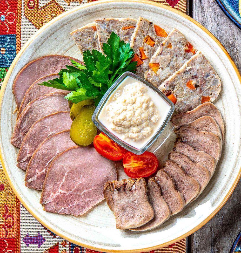 Нежный говяжий язык, плотный зельц и сочный лангет собрались за одним столом. Маринованные огурцы и черри — для свежести, соус из хрена — для честности. Тут без компромиссов: мясо, хрен и разговор по душам