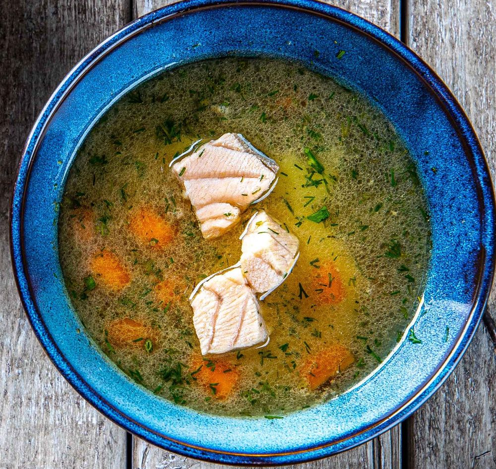 Насыщенная уха на прозрачном бульоне из чира и нежного лосося, это сочетание северной силы и деликатной утонченности