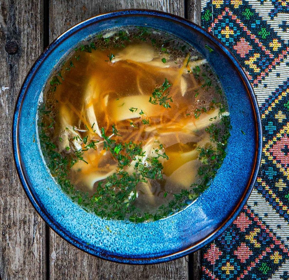 Домашний, честный, согревающий. Куриный бульон с мясом, морковью, луком и сельдереем. Чеснок для аромата, фетучини для сытости, укроп для настроения