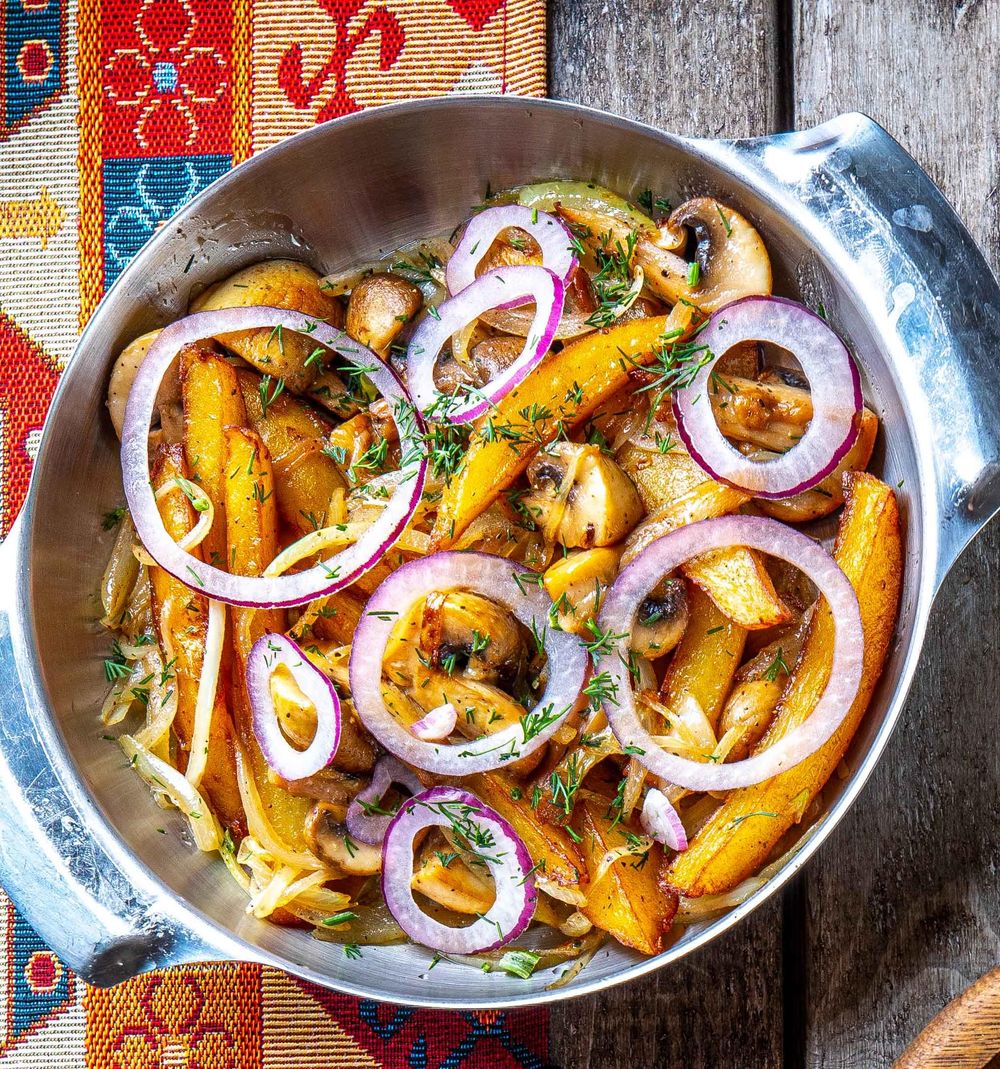 Золотистая картошечка, жареная до хруста, с шампиньонами и луком — тут всё честно. Укроп сверху, специи внутри