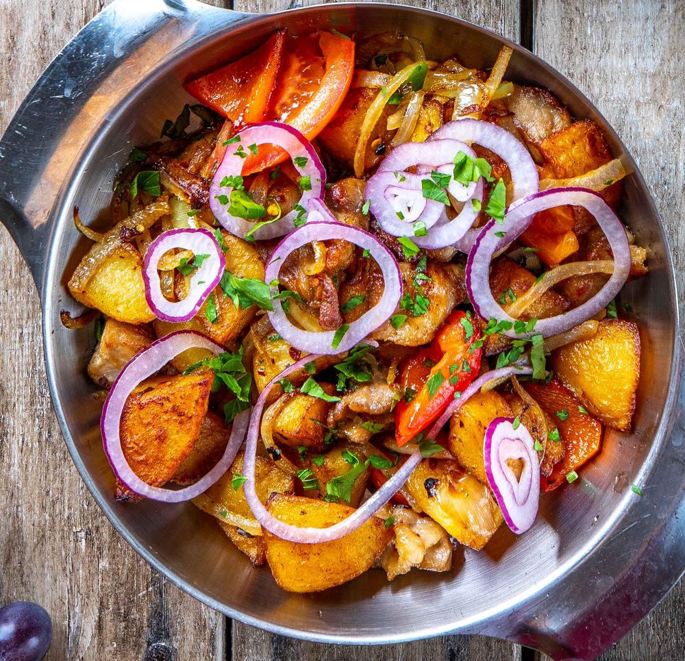 Сочная свинина, обжаренная до румяной корочки с картофелем, репчатым и красным луком. Болгарский перец и помидоры добавляют сочности. Горячее, сытное, с тем самым духом грузинского застолья