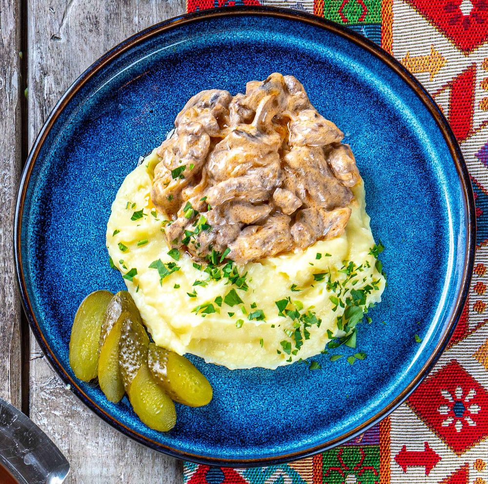 Говядина, томлёная в сливочном соусе с репчатым луком и шампиньонами. Подаётся на подушке из картофельного пюре с маринованными огурцами